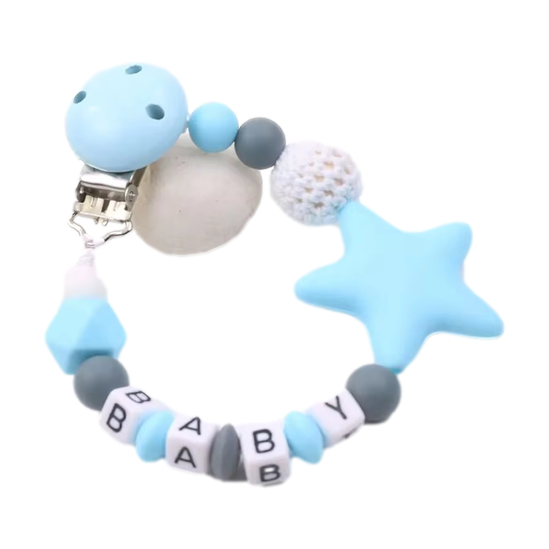 Esta tierna y práctica cadena de silicona es ideal para acompañar a tu bebé en su etapa de dentición. Con cuentas suaves al tacto, un clip seguro y un mordedor en forma de estrella, ofrece alivio y diversión mientras ayuda a estimular el desarrollo sensorial del bebé. Su diseño encantador con letras “BABY” y colores suaves es perfecto para combinar con cualquier outfit.