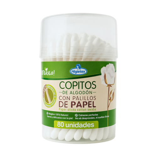 Los copitos de algodón Higietex con palillos de papel son una opción ecológica y segura para el cuidado personal diario. Diseñados con algodón 100% natural y cabezales perfectamente prensados, son suaves con la piel y resistentes al uso, ideales para bebés, niños y adultos.