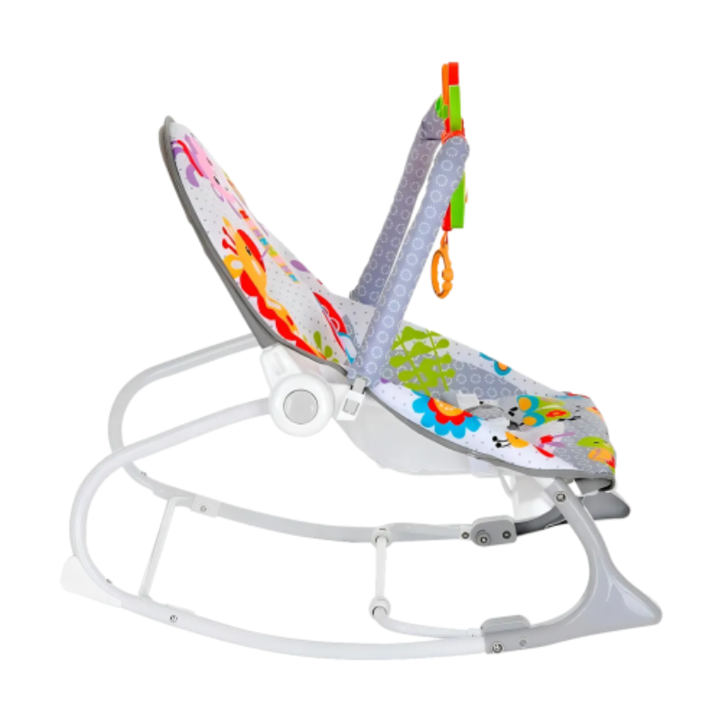 Cuenta con una estructura robusta y ligera que permite utilizarla como silla fija o mecedora, adaptándose al ritmo del bebé. Incluye barra frontal con divertidos juguetes colgantes para estimular la coordinación visual y motriz. Su sistema de vibración suave ayuda a calmar al bebé en momentos de descanso. El asiento es acolchado, reclinable y desmontable para facilitar la limpieza, e incorpora un cinturón de seguridad de 3 puntos que mantiene al bebé protegido.