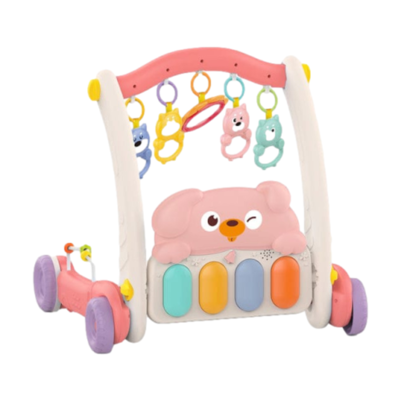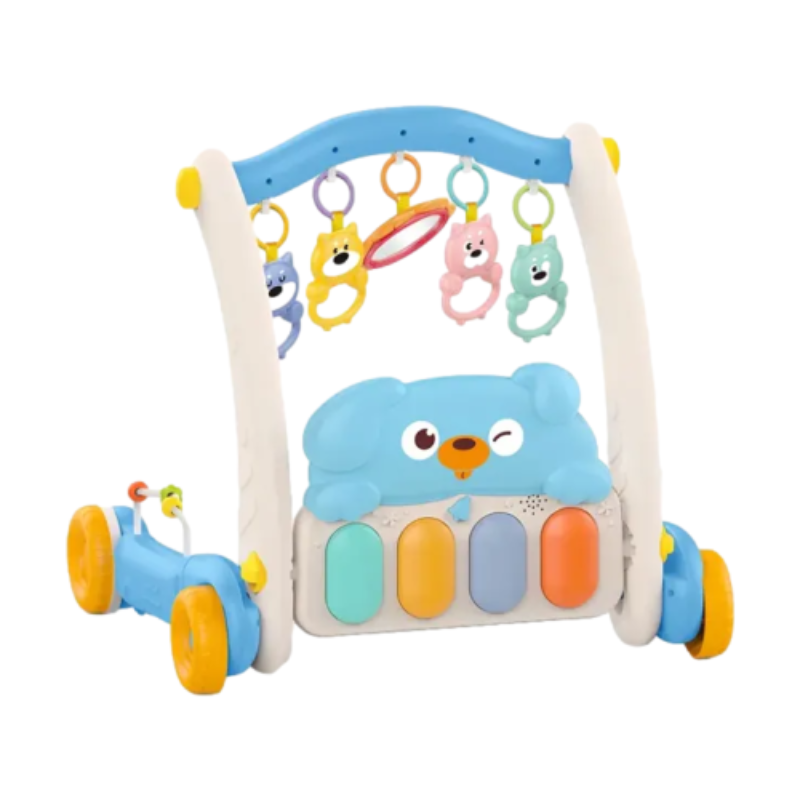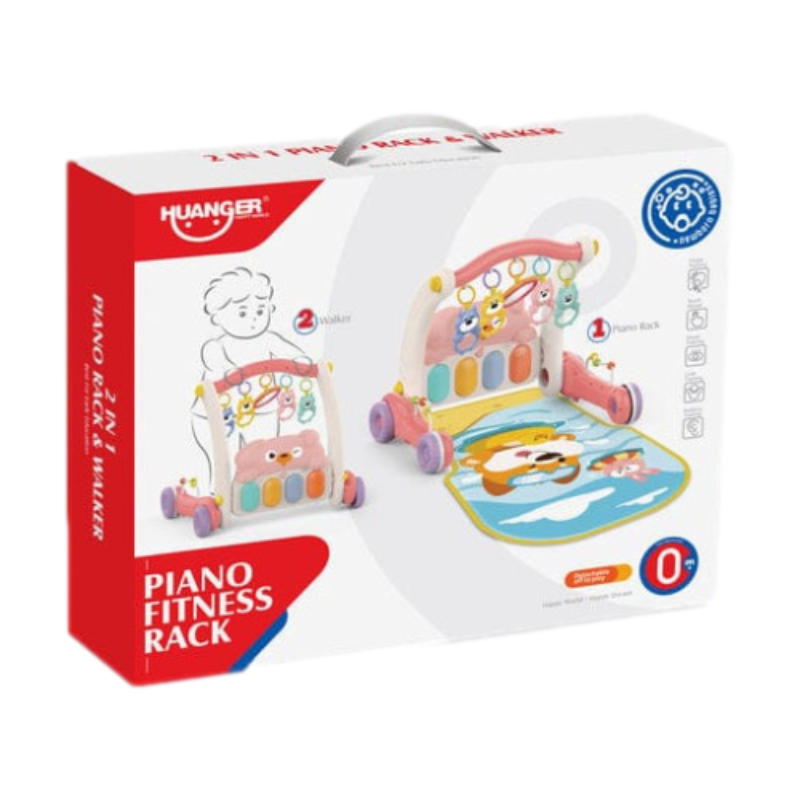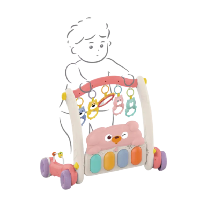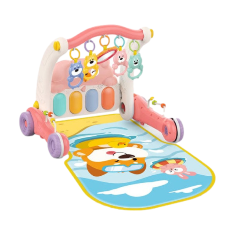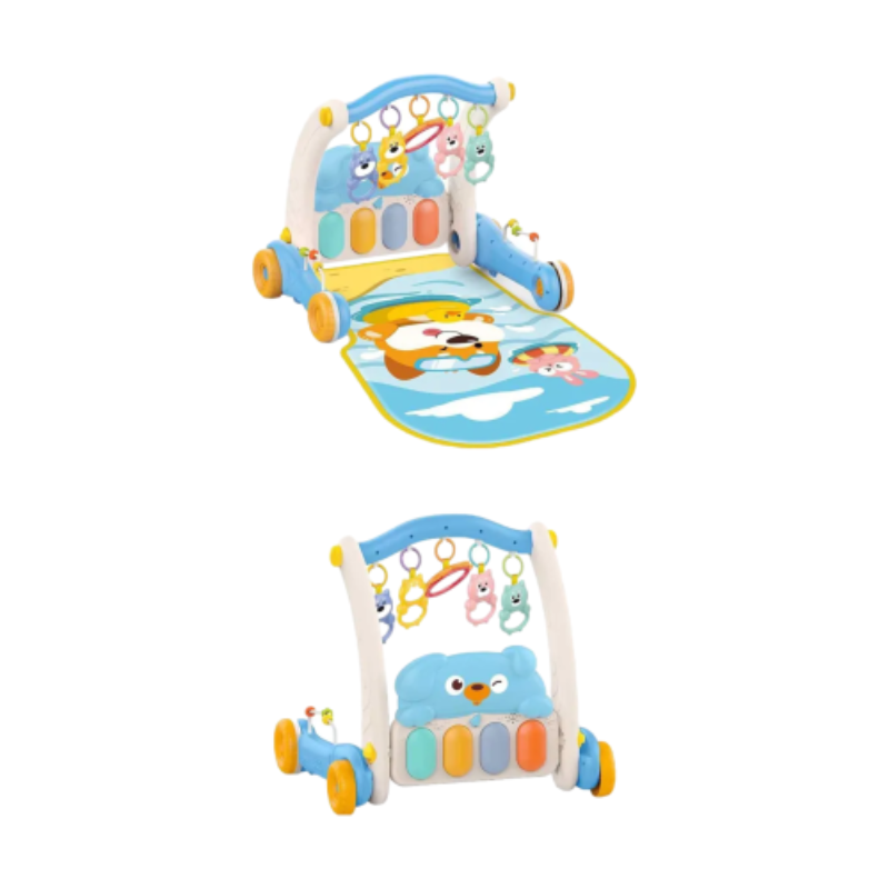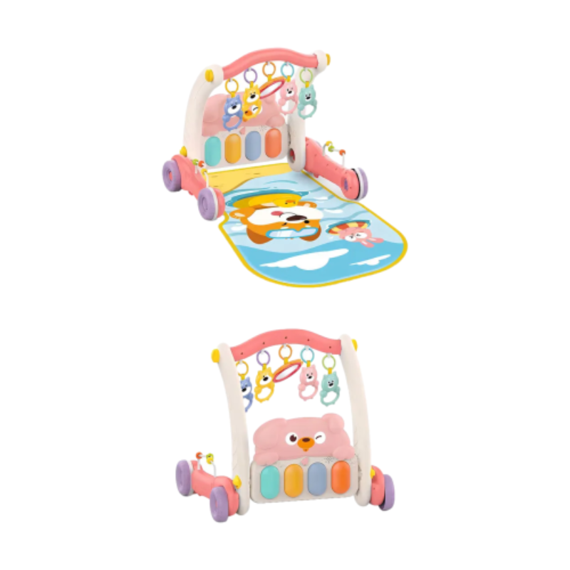 Ofrece dos modos de uso en un solo producto: gimnasio musical para bebés en etapa de exploración y caminador para los primeros pasos, facilitando un desarrollo integral. Incluye piano con luces y sonido que estimulan el oído y la coordinación motriz, juguetes colgantes desmontables que fortalecen el agarre y la curiosidad, ruedas resistentes con sistema de freno para mayor seguridad y tapete acolchado de fácil limpieza con diseños atractivos para captar la atención del bebé. Su estructura estable y materiales seguros lo convierten en una opción confiable para el juego diario.