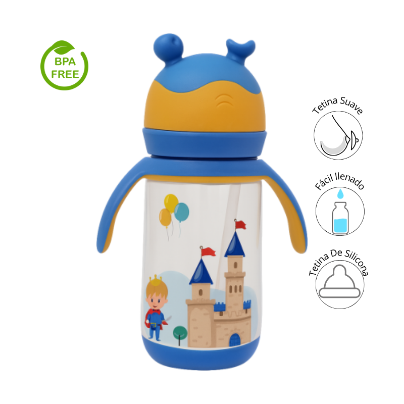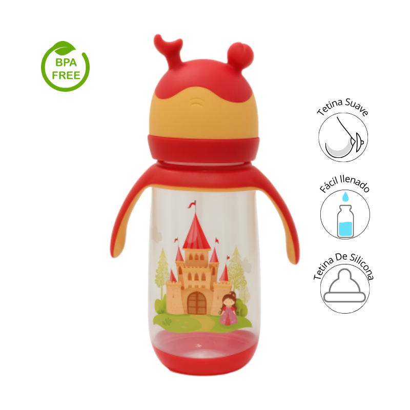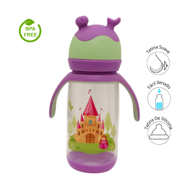 Este encantador tetero con diseño de castillos y colores vibrantes está pensado para hacer de la hora de la alimentación una experiencia divertida y cómoda. Equipado con asas ergonómicas y tapa protectora con forma de antenitas, es ideal para manos pequeñas en etapa de transición hacia la independencia.