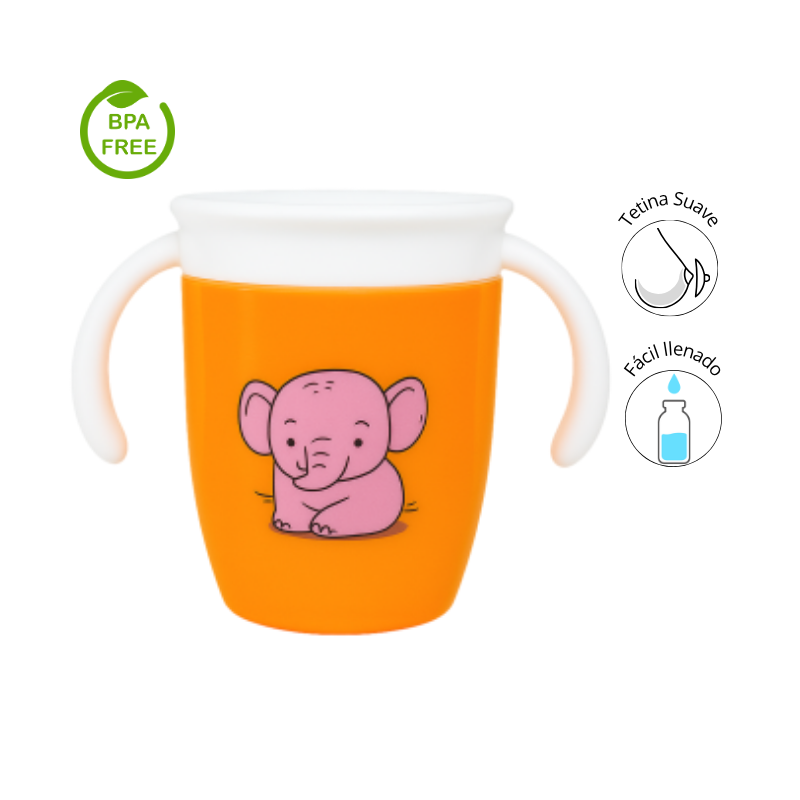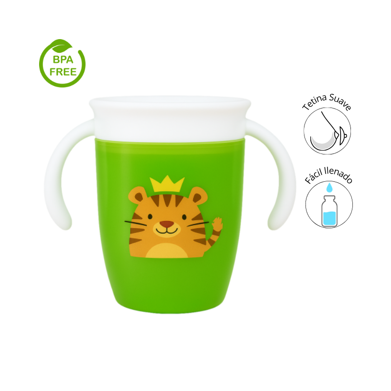 Este vaso entrenador es ideal para acompañar la transición del bebé del biberón al vaso convencional. Diseñado con ilustraciones tiernas como un tigre con corona y un elefantico rosado, este vaso combina funcionalidad y diversión en un solo producto.